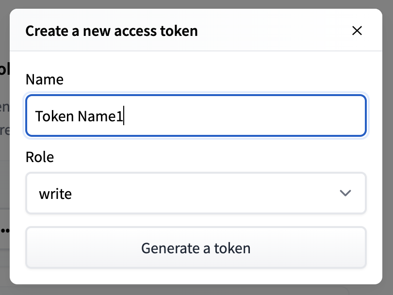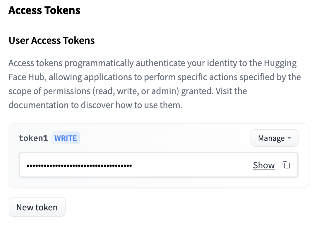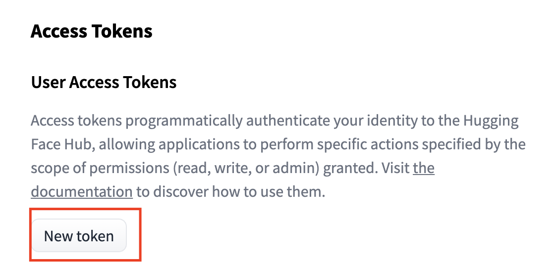 Huggingface 홈페이지에 로그인한 후 오른쪽 상단 프로필 > Settings > Access Tokens을 누르거나 로그인 후에 링크를 클릭하면 바로 토큰을 관리할 수 있는 페이지가 나타납니다. 페이지 상단을 보면 User Access Tokens부분이 있는데, 여기서 New token을 눌러 토큰을 생성할 수 있습니다. 이 때, Role을 read로 하면 권한 에러가 발생하므로 write로 설정해야합니다.